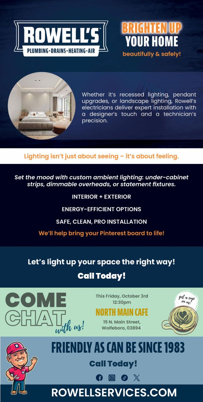 "Friendly As Can Be Since 1983!" When you need help with your plumbing, drains, heating, cooling or electrical in Meredith, you can always rely on Rowell's Services! Call us now or book online!